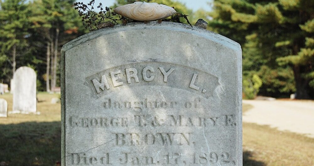 The 1892 gravestone of Mercy L. Brown in Exeter, Rhode Island. Mercy’s exhumation during the New England vampire panic illustrates how vampire folklore influenced real beliefs in the U.S.