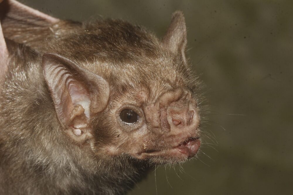 A close-up of a real vampire bat (Desmodus rotundus). Despite their name and diet of blood, vampire bats are small creatures that rarely bite humans. The discovery of these bats in the New World added a new dimension to vampire folklore, linking myths to nature.